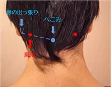 頭の後ろ、髪の生え際で後頭部の中央のへこみと、耳の後ろにある骨のでっぱりをむすんだ線の真ん中にあります。親指を当て、他の四本の指で頭を支えるようにすると押しやすいです。
