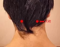頭の後ろ、髪の生え際で2本の太い筋の外側の際にあります。頭に少し響くくらいの強さで押し上げましょう。