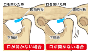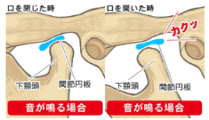 関節円板がズレて下顎頭に引っ掛かり、口を開けたときに関節円板が下顎頭に乗り上げる時に音が出ます。