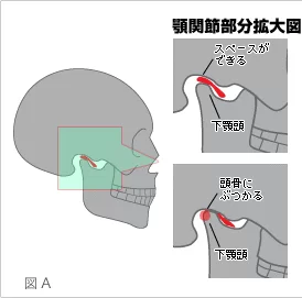 関節円板の形が変形していると、顎を動かすときに関節円板が変な方向へ飛び出てしまったり、顎の開閉に引っ掛かりが出て、関節円板が移動すると、音がします。