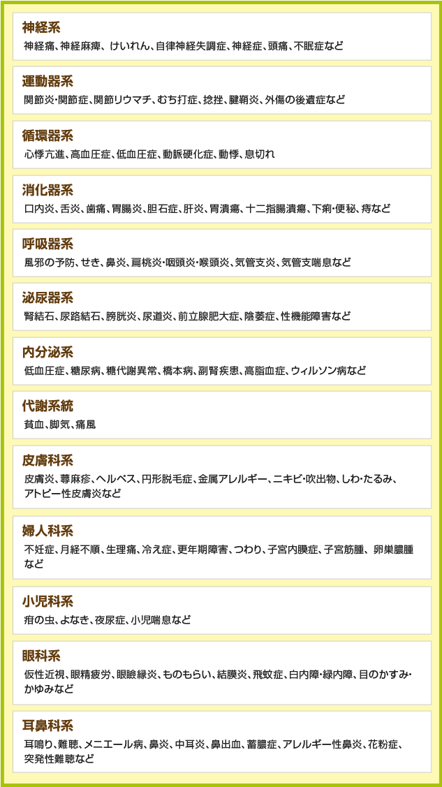ただし、西洋医学的にとらえた疾患なので、東洋医学的な解釈で改善可能な症状がこのほかにも多数あります。上記に載っていない症状でも、気になることがありましたら、一度お問い合わせください。