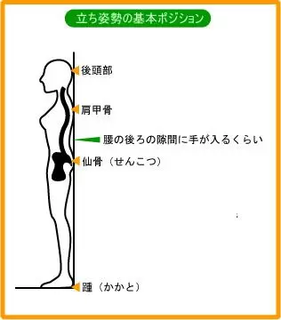 壁の前に立って頭、肩甲骨、殿部、かかとを順番につけていきます。