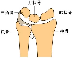 手首の小指側にある軟骨(左の図で表すと三角骨、月状骨、尺骨に囲まれる色が濃くなっている部分です。この図は左手です。)を痛めている状態をいいます。