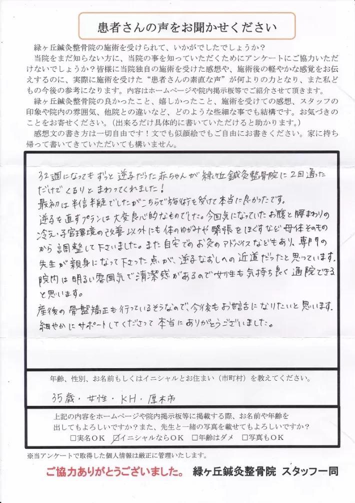 32週になってもずっと逆子だった赤ちゃんが緑ヶ丘鍼灸整骨院に2回通っただけでくるりとまわってくれました!